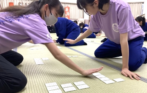 令和3年に創部した競技かるた部は中高いっしょに活動しており、試合形式の練習を通じて日々精進しています。近江神宮で開催される全国選手権大会団体戦京都府予選と各個人で出場する昇級昇段大会を目標に活動をしています。