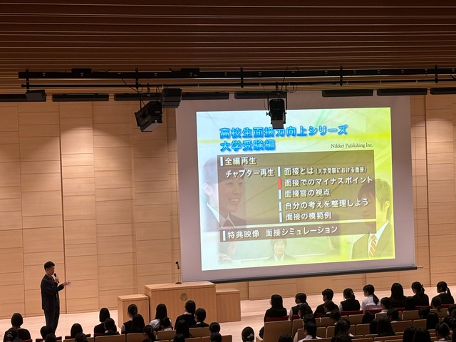 京都女子大学専願・併願推薦をはじめ、他大学の総合型選抜、学校推薦型選抜(公募推薦・指定校推薦)、一般選抜など、面接試験を控えた高校3年生を対象として、10月9日(木)1限、面接対策オリエンテーションを学園講堂で開催しました。