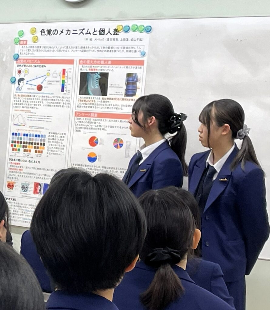 3月16日(月)、高校1年顕道コースによる探究成果ポスター発表会を開催しました。本発表会は、生徒たちが一年間かけて取り組んできた探究学習の成果を発表する場として実施されたものです。当日は、1グループ1〜4名で構成された全13グループが、それぞれのテーマについてポスターを用いて発表を行いました。生徒たちは、自分たちの探究内容を分かりやすく伝えるため、工夫を凝らしながら丁寧に解説していました。発表後の質疑応答では、鋭い質問や多様な視点からの意見が次々と交わされ、生徒たちは新たな視点に触れながら、今後の探究につながる課題を見出していました。生徒の総括からも、こうした意見交換を通して学びが一層深化していたことが読み取れ、探究学習ならではの学び の広がりを感じさせる時間となりました。一年間の探究活動と本発表会で得た学びを、今後の学習や探究活動に生かしていくことが期待されます。