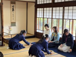 ウィステリア科の茶道の授業は高校2年生まで実施しています。3年生は亭主という大役にあたり、事前に茶道の特別授業をしましたが、これまでの学びの成果はしっかりと身についており、その所作は時間の隔たりを感じさせないほどに、とても立派に整えられていました。